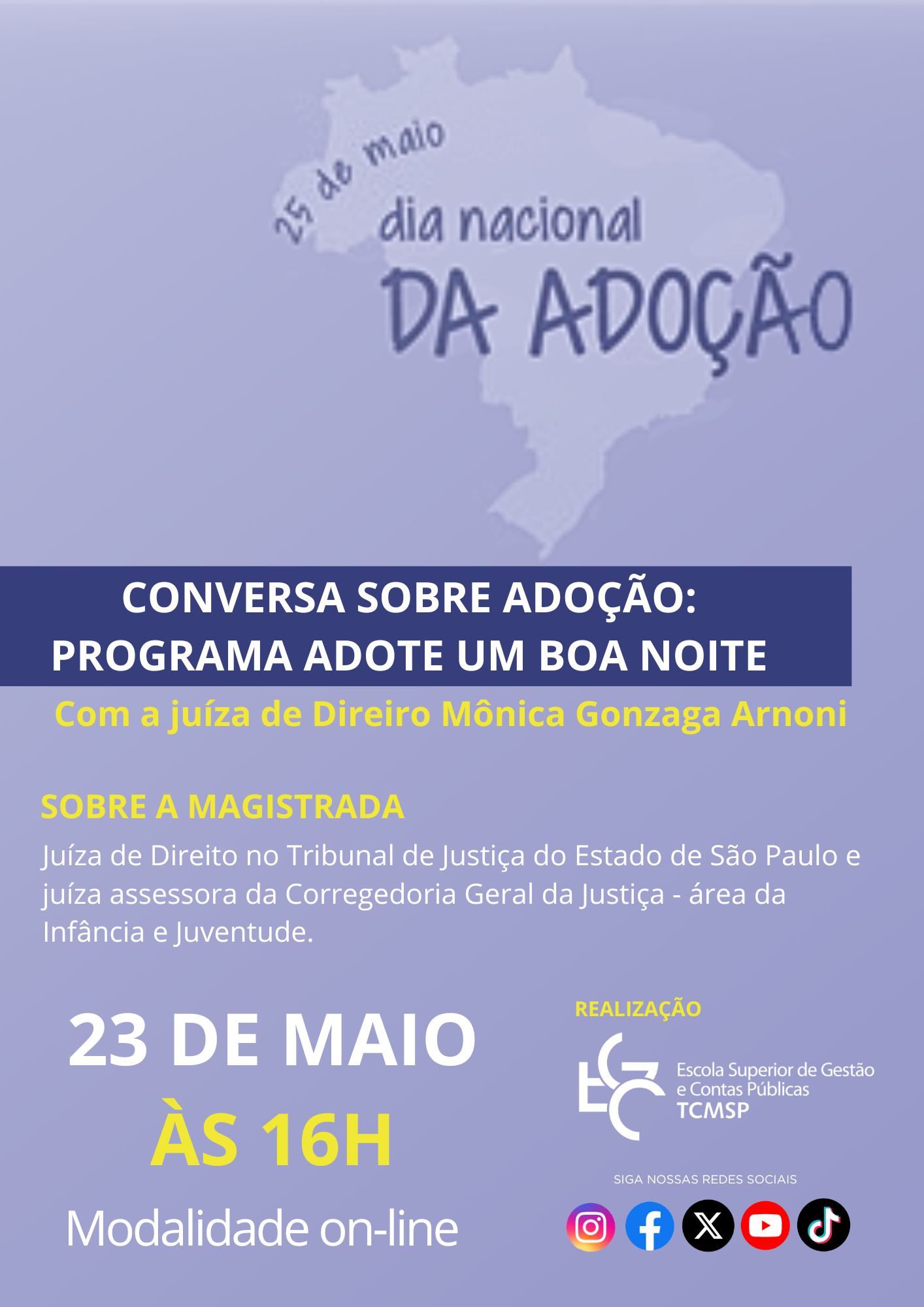 Para trazer este debate ao Tribunal de Contas do Município de São Paulo, a Escola Superior de Gestão e Contas recebe a Juíza de Direito Monica Gonzaga Arnoni, para uma conversa sobre o Programa "Adote um Boa-noite", desenvolvido no Tribunal de Justiça do Estado de São Paulo.
